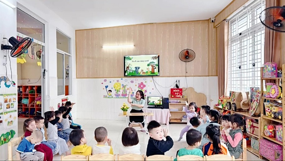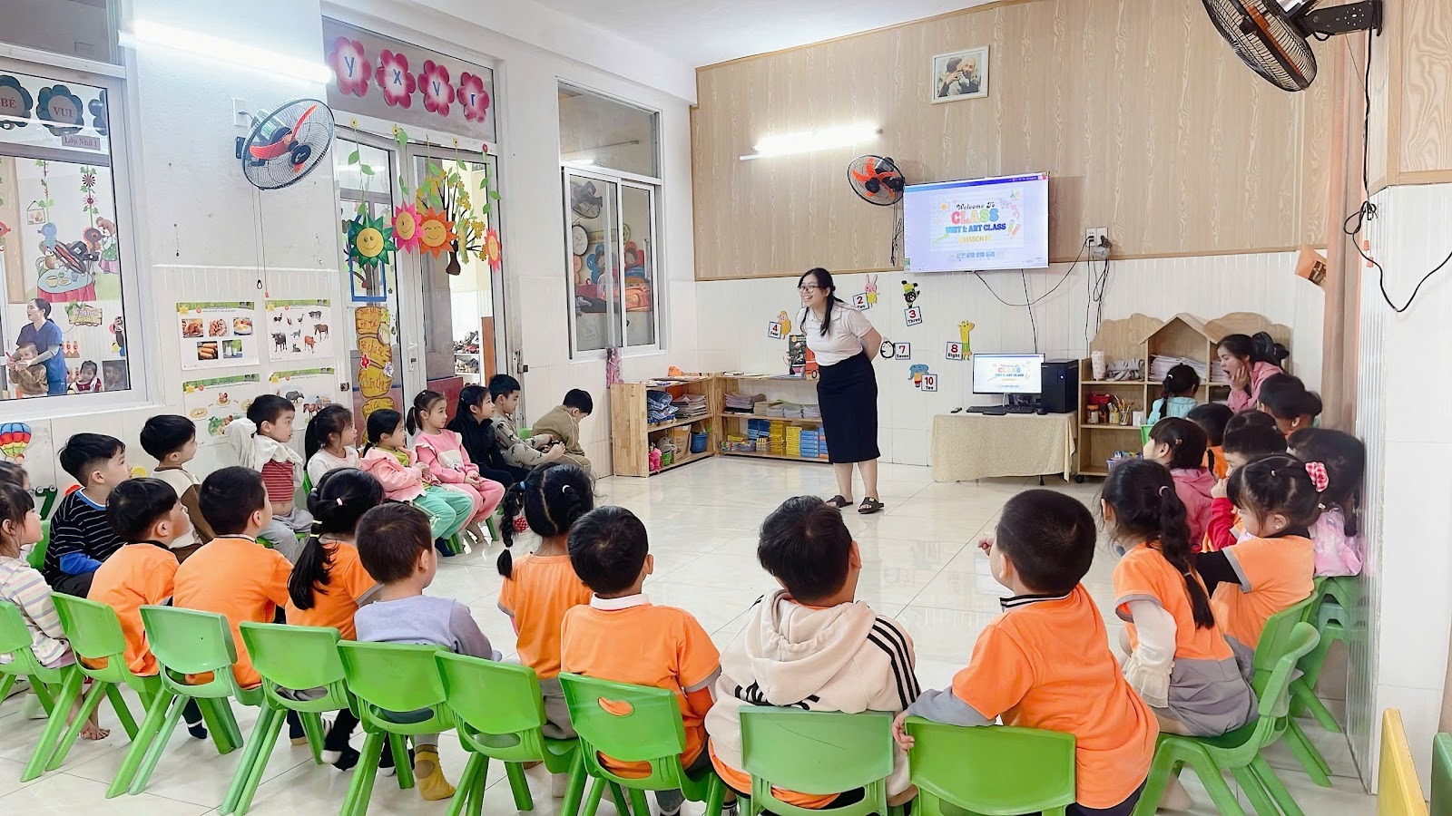 Trong các giờ học tiếng Anh, lớp học được tổ chức theo hình thức học mà chơi - chơi mà học, nơi giáo viên và trẻ cùng tương tác thông qua bài hát, trò chơi, hình ảnh và các hoạt động ứng dụng công nghệ. Trẻ tiếp cận ngôn ngữ thứ hai một cách tự nhiên, không áp lực ghi nhớ máy móc, từ đó hình thành phản xạ nghe - nói và sự tự tin trong giao tiếp ngay từ sớm.
